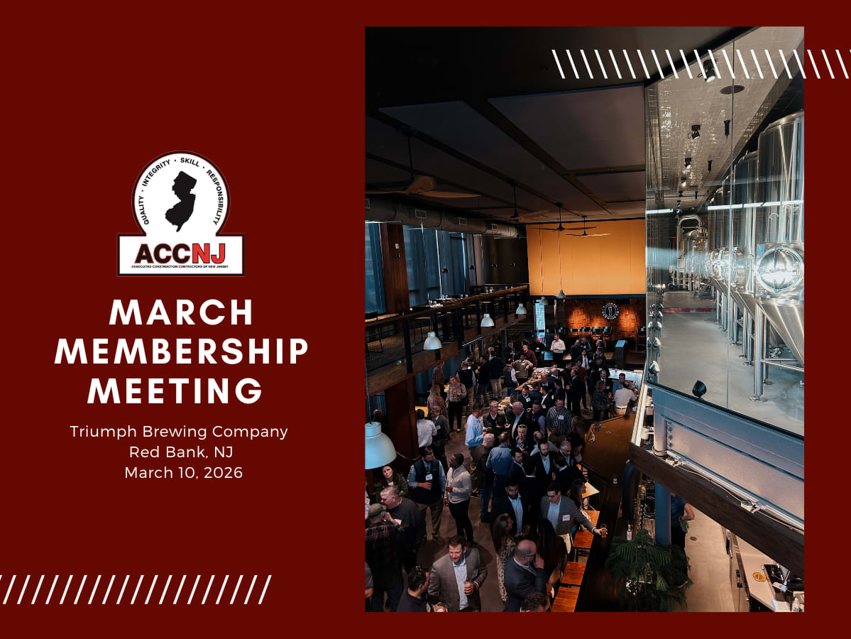 The Associated Construction Contractors of New Jersey has scheduled the next Membership Meeting for Tuesday, March 10, 2026, 5:00 PM, at the Triumph Brewing Co., Red Bank, NJ.
