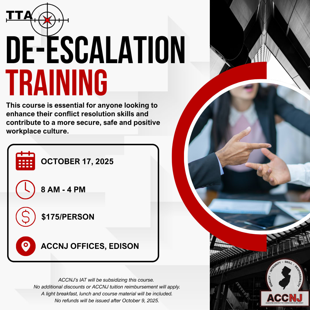As part of ACCNJ’s 2025 Workshop Series, we are pleased to bring back our De-Escalation Training on October 17, 2025, from 8 AM - 4 PM at the ACCNJ Offices in Edison.