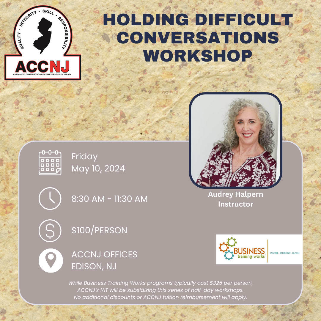 As part of our Educational Workshop Series, ACCNJ will be hosting a Holding Difficult Conversations workshop on May 10, 2024, 8:30 AM at the ACCNJ Offices in Edison.