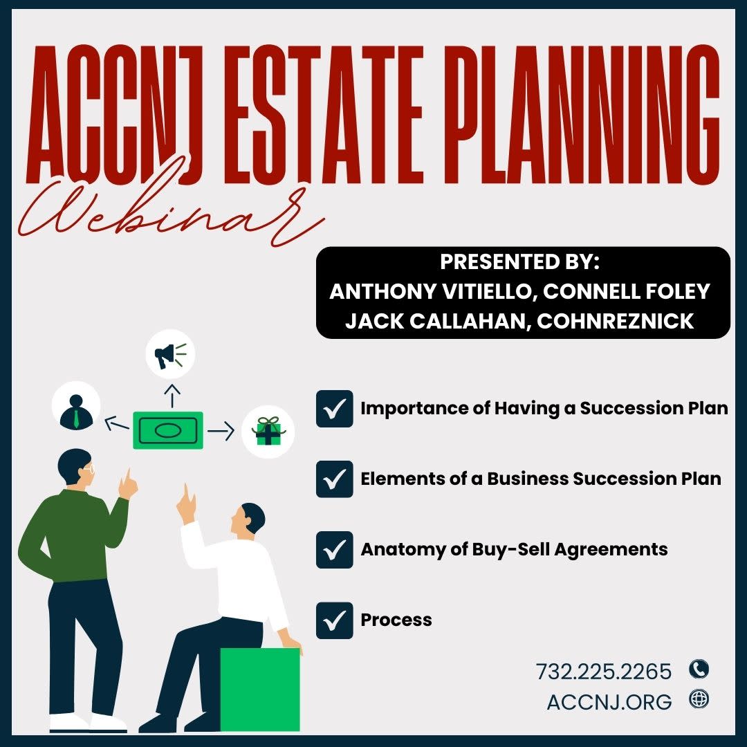 On Wednesday, February 7, 2024, at 9:30 AM, ACCNJ will host an estate planning webinar to address the importance of succession planning and the questions you should be asking your professionals when crafting one. Join us for an opportunity to gain valuable insight and learn to make informed decisions for the financial wellbeing of your family and business.
